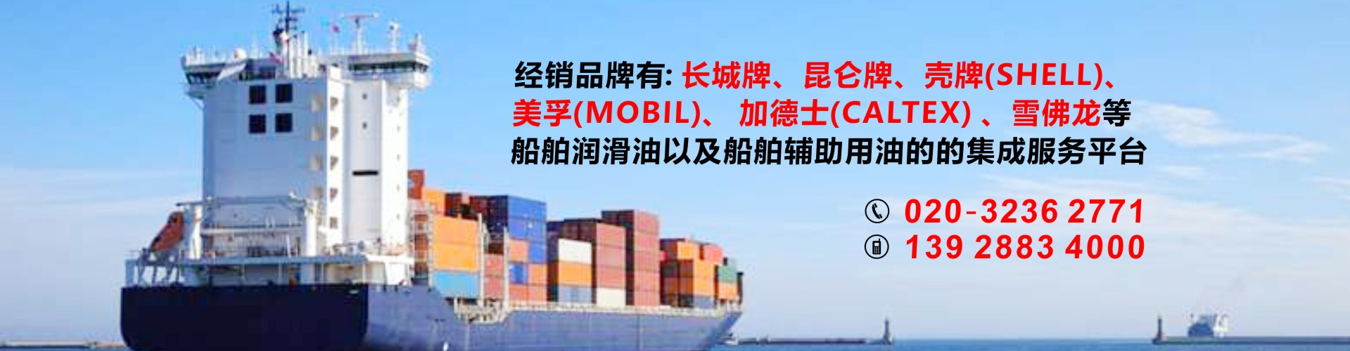 公司代理中石化長城潤滑油以及中石化國際品牌SINOPEC潤滑油,經銷品牌有昆侖牌、殼牌(SHELL)美孚(MOBIL)加德士(CALTEX)雪佛龍(CHEVRON)是船舶潤滑油以及船舶輔助用油的的集成服務平臺,也可按照船東要求提供船舶消防救生用品、勞保用品、五金燈具及甲板用品等船舶配套產品。